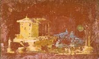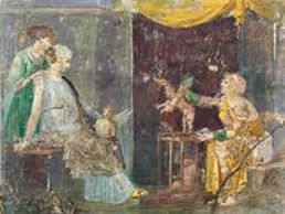 This fresco depicts a lady selling Cupids to a noblewoman. It is meant to show the sale of Love, and remains one of the most unique discoveries of the villas at Stabiae.