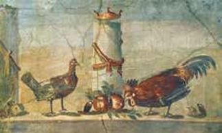 A beautiful seen of a rooster and hen picking at some food on a ledge. From the ancient city of Herculaneum