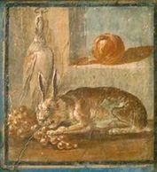 The fruits of a successful hunt, there is a hare and duck along with some vegetables. A snapshot into the diet of antiquity. From the House of the Deer at Herculaneum.